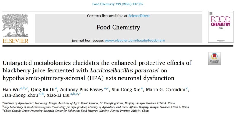 近日,农产品加工研究所食品生物工程创新团队在国际食品营养学权威期刊《Food Chemistry》(中科院一区TOP,IF5y=9.8)上发表了题为“Untargeted metabolomics elucidates the enhanced protective effects of blackberry juice fermented with Lacticaseibacillus paracasei on hypothalamic-pituitary-adrenal (HPA) axis neuronal dysfunction”的研究论文。该成果是我院在益生菌功能机制解析与农产品生物加工领域形成的原创性技术,为益生菌功能产品的开发提供了重要理论依据与创新路径。吴寒博士为论文第一作者,刘小莉研究员为通讯作者,江苏省农业科学院为第一完成单位。该研究得到了江苏省自然科学基金和江苏省重点研发计划等项目的资助。